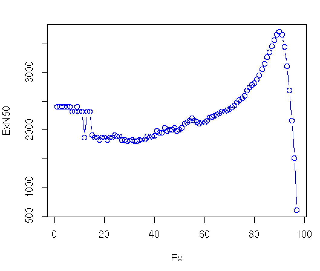 Fig 8. Plotting the Ex value against N50 shows that the E90N50 for this assembly yields the highest value and is a better indicator of assembly quality than the normal N50 metric. Figure derived from Trinity’s website.